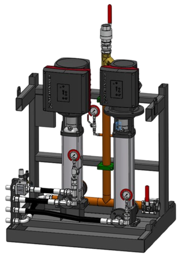 L’impianto può alimentare una rete centralizzata, con una portata sufficiente ad alimentare più macchine e con sistemi ridondanti per continuare ad alimentare la rete in caso di guasto della pompa.